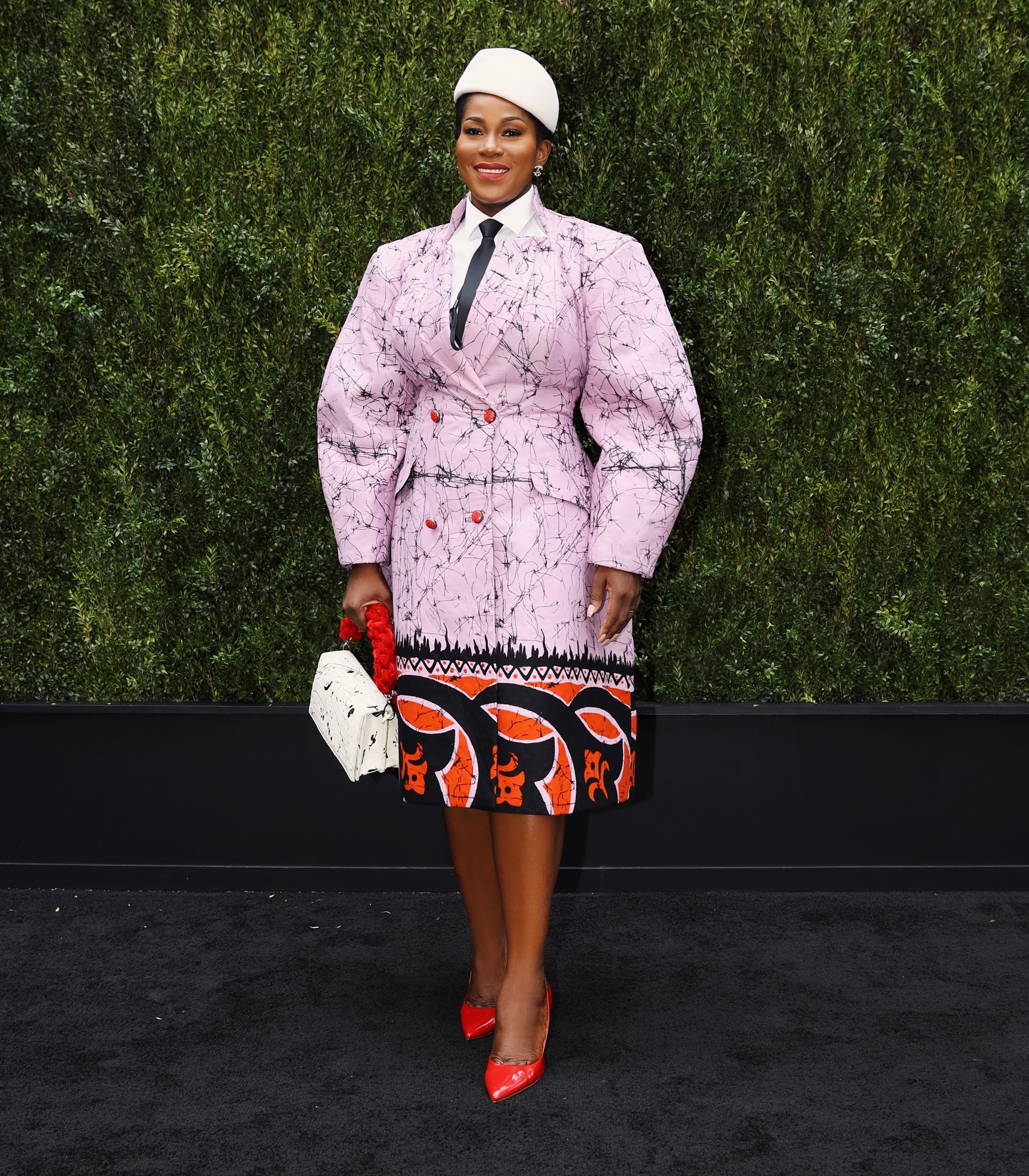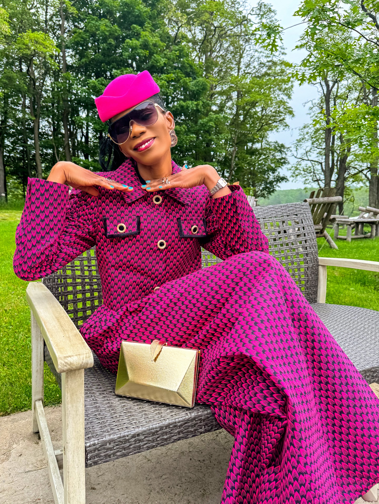 Designed by Tessy Oliseh‑Amaize, the piece featured a sharp, structured silhouette with bold African-print motifs woven into double-breasted tailoring. Dramatic puffed sleeves and clean lines perfectly married elegance with intellect.