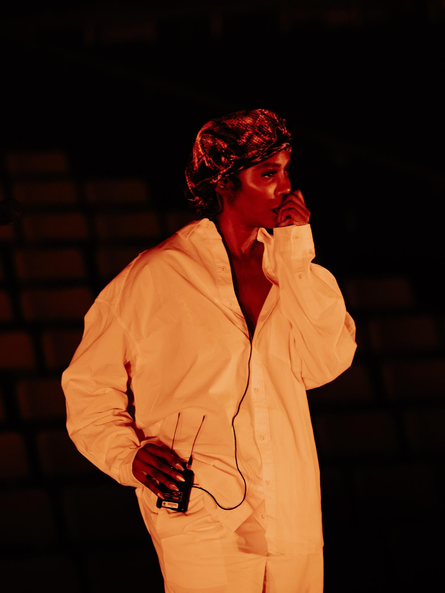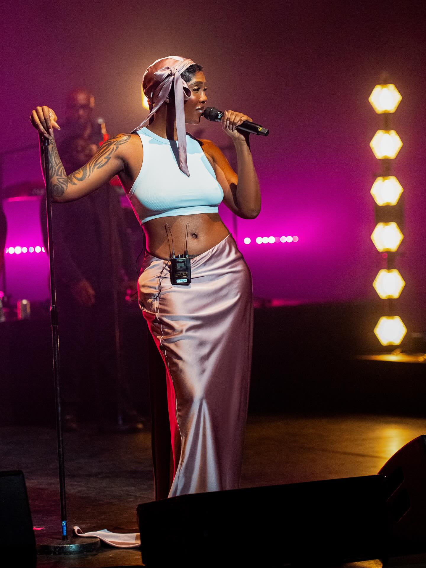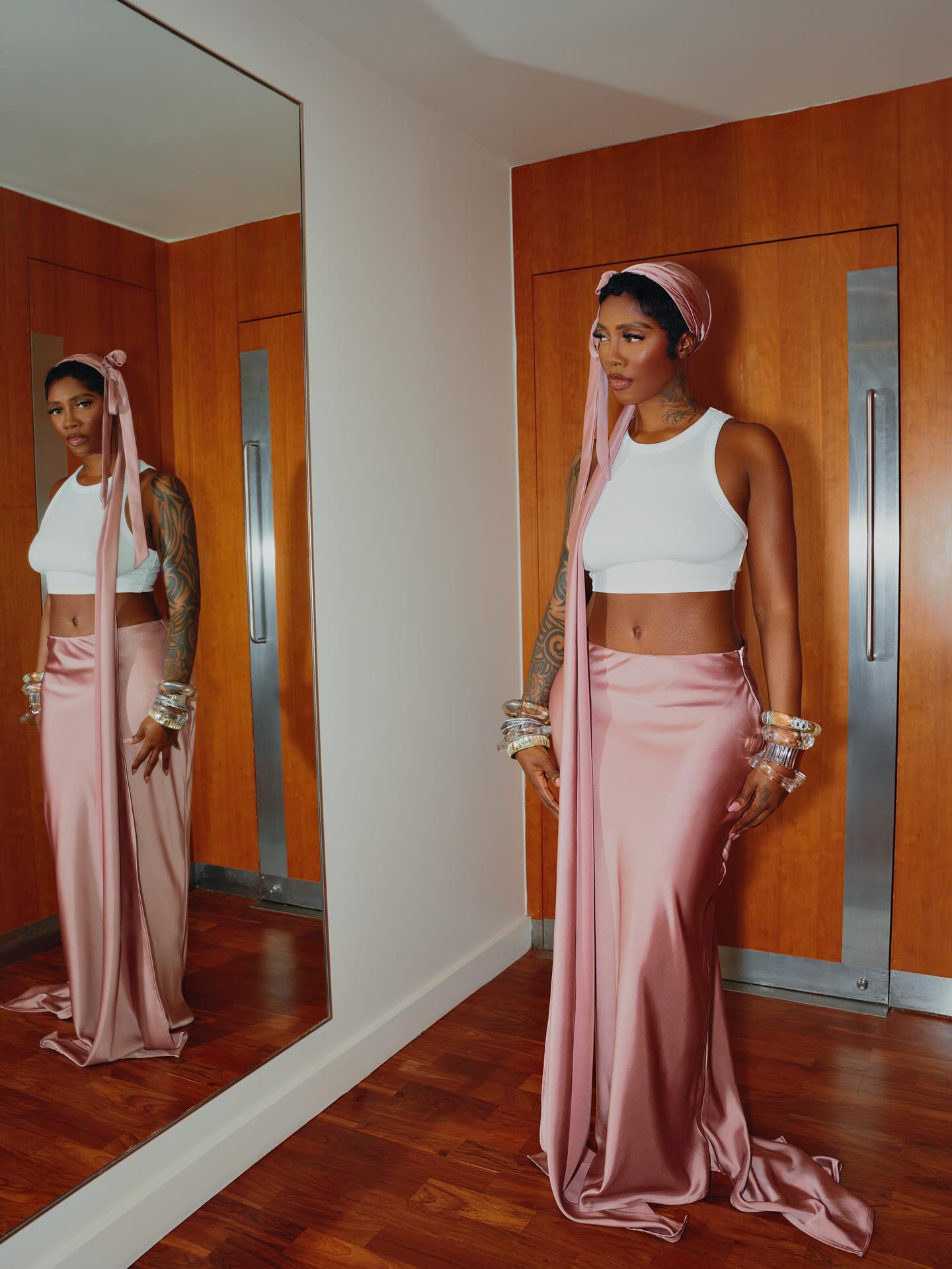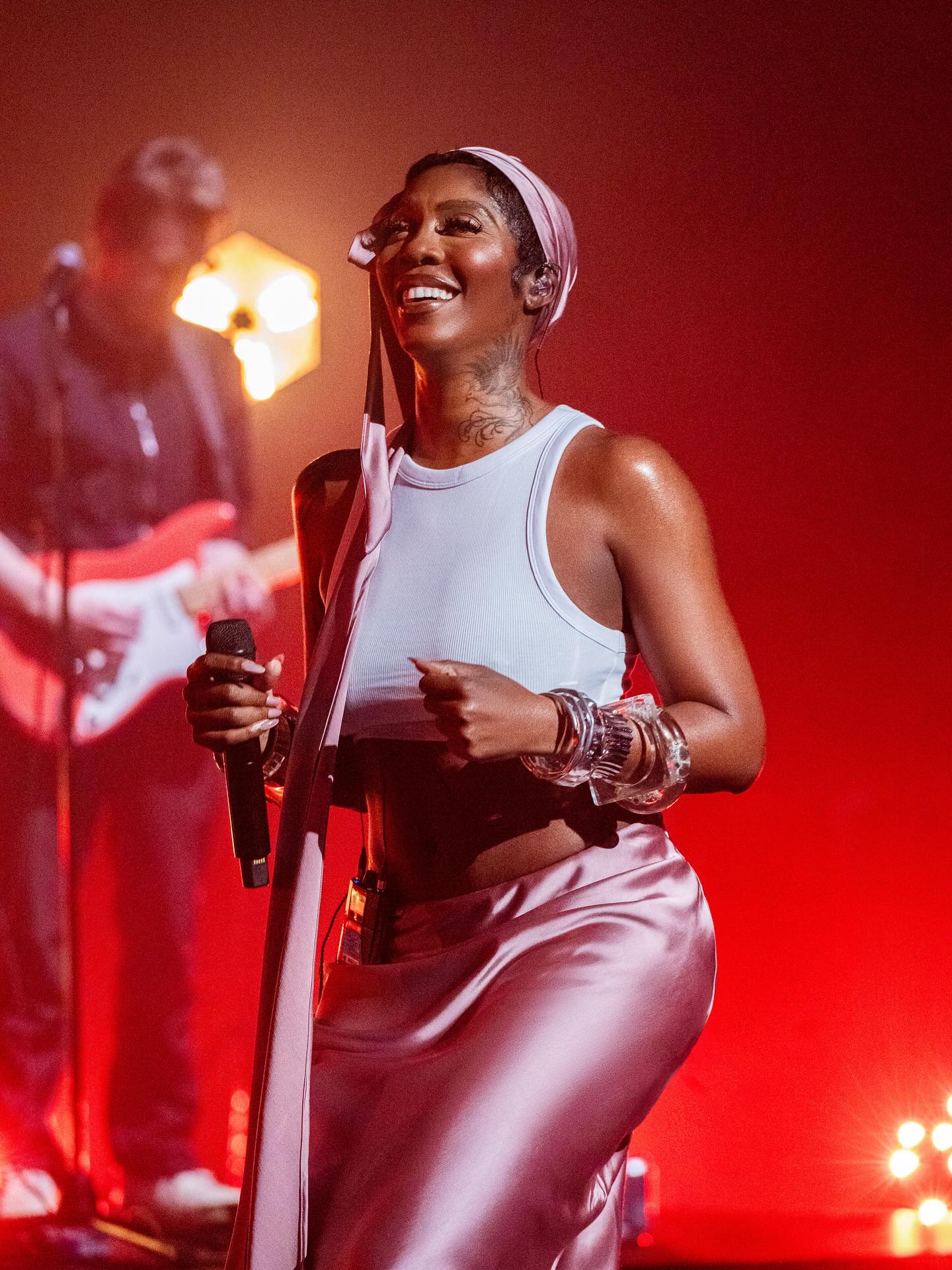 Her performance look was a masterclass in understated elegance: a white cropped tank paired with a flowing blush-pink satin skirt tied at the waist, topped with a matching headscarf bow and clear statement bangles. It was simple yet unforgettable—a nod to minimalist sophistication that still steals the spotlight